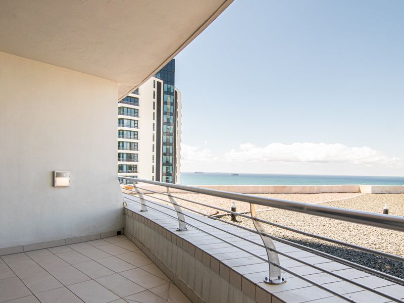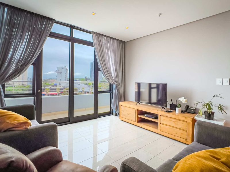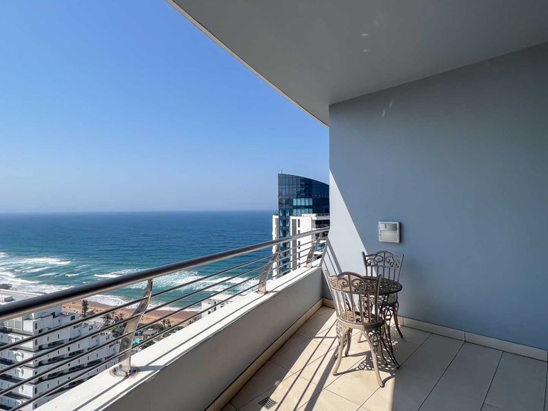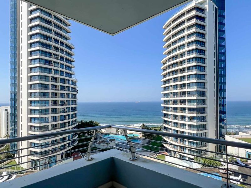 Mall-side coastal lifestyle in Umhlanga with panoramic sea views, an 11m2 balcony for sunrise coffee, two bedrooms, two bathrooms and covered parking.