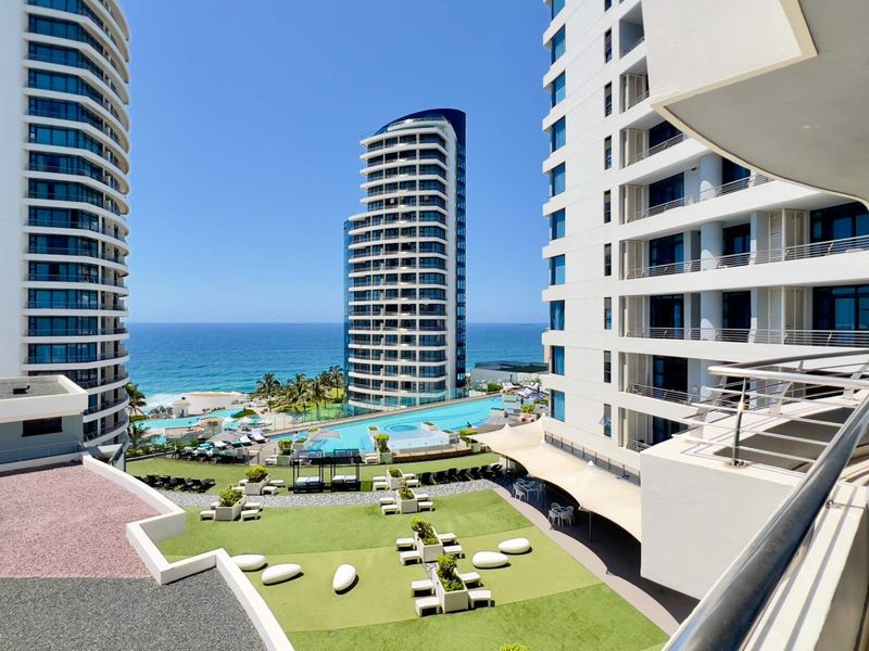 Panoramic ocean-view living in The Pearls of Umhlanga® — furnished open-plan apartment with balcony, resort pool and private beach access; three bedrooms, three bathrooms, two covered parking.