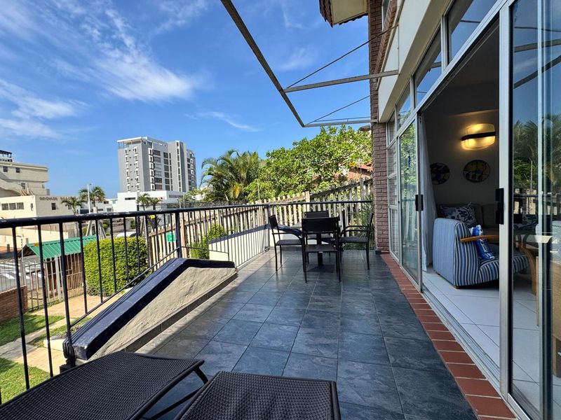 Coastal living with rental income potential just steps from Umhlanga beach and promenade; furnished 2‑bedroom, 2‑bath apartment with sea-view balcony perfect for braais and parking.