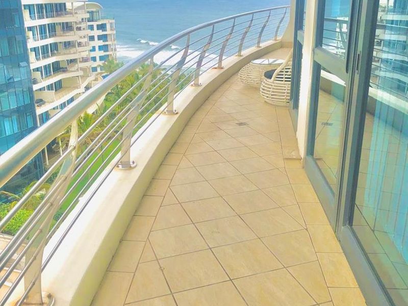 Lock-up-and-go living near Gateway Mall and Umhlanga beachfront, wide open-plan layout with a modern chef’s kitchen and large enclosed balcony offering tranquil sea glimpses; three bedrooms, three bathrooms.