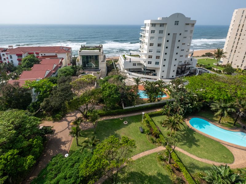 Seaside living beside the iconic Oyster Box Hotel in Umhlanga, featuring a wrap-around balcony with panoramic Indian Ocean and lighthouse views, manicured gardens and pool.