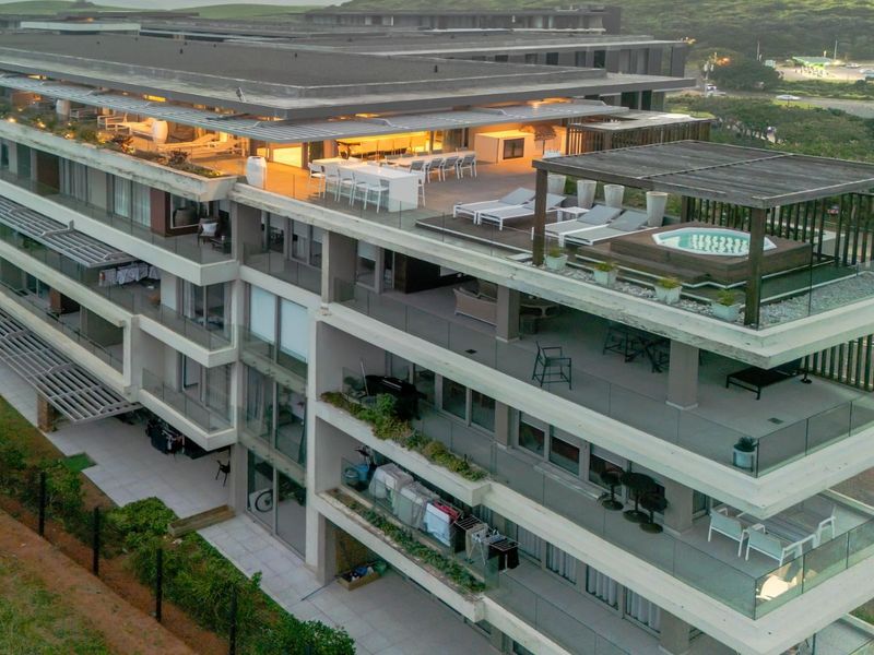 Sky-high coastal living in Sibaya Coastal Precinct — panoramic Indian Ocean views and a wraparound entertainer’s terrace with jacuzzi and built-in braai; four bedrooms, five bathrooms, secure parking.