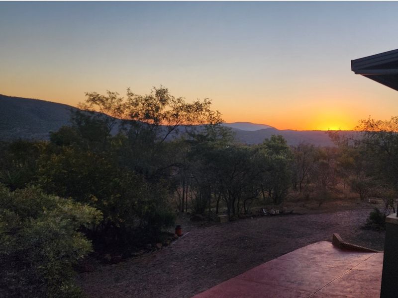Game-reserve living at Zwartkloof, Bela Bela — endless bushveld sunsets and mountain views, two bomas with pizza oven and large Jacuzzi. Five ensuite bedrooms, three garages.