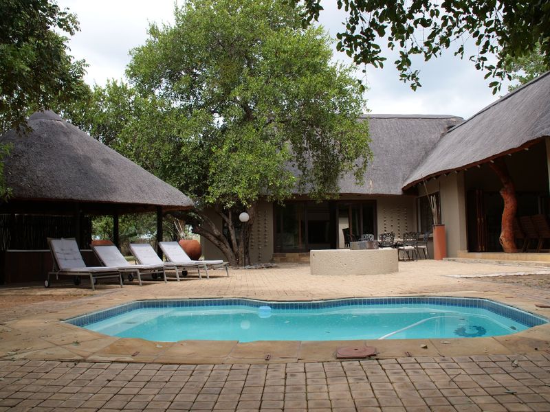 5 bedrooms, 5 bathrooms lodge with 2 garages, open plan kitchen, commercial kitchen, and swimming pool in Mabalingwe Game Reserve.