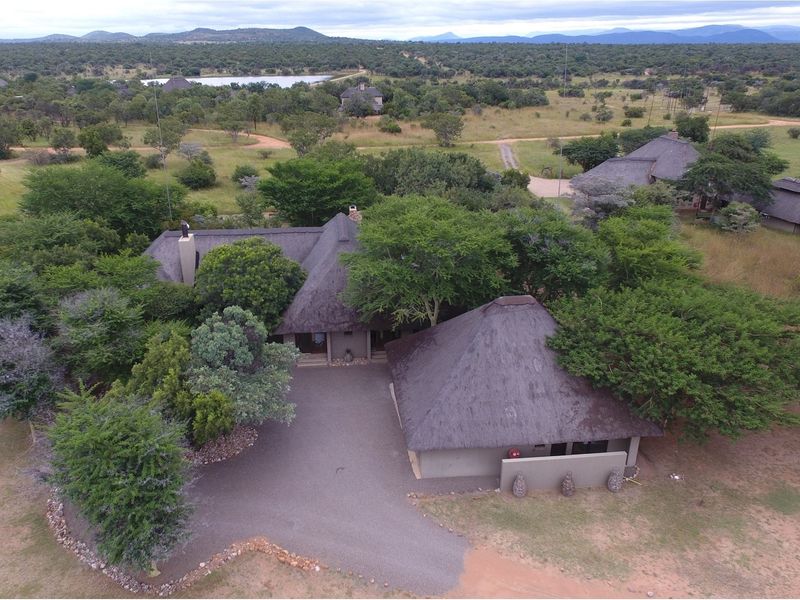 Bushveld lifestyle with roaming game and panoramic Waterberg views in Highlands Wilderness, 20 km from Bela Bela — thatch home with outdoor braai, waterhole and four en-suite bedrooms.