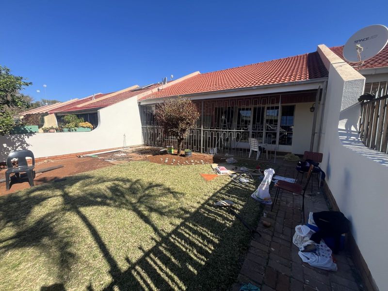 Peaceful low-maintenance living in Mookgophong's secure, well-kept complex, with a private courtyard garden and solar backup — three bedrooms, two bathrooms and double garage.
