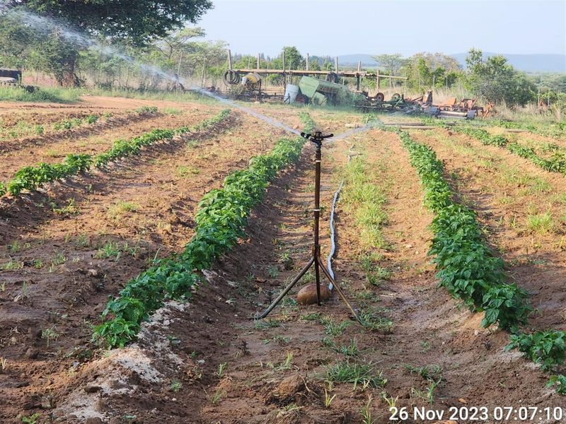 Country-living opportunity 15km from Mookgopong with productive irrigation, multiple high-capacity boreholes and large reserve dams — family home with pool and expansive storage for farming.