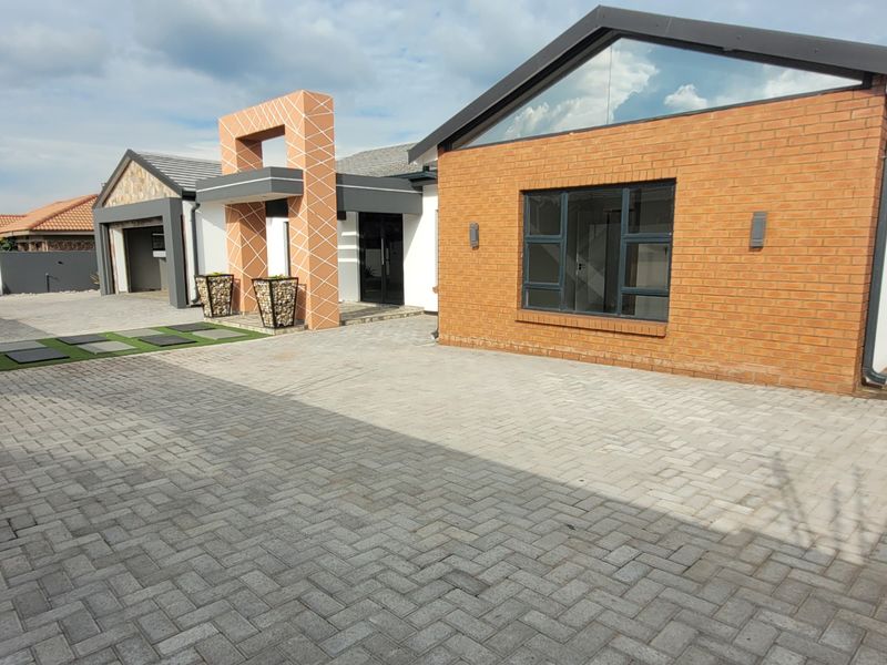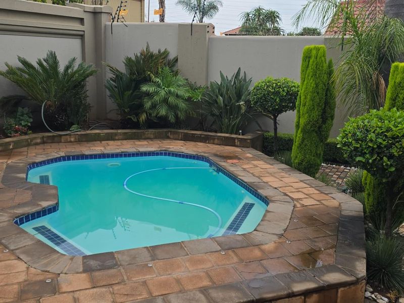 Relaxed family living in a tranquil setting with welcoming water feature, covered braai patio and pool — four bedrooms, three bathrooms and double garage plus solar backup for peace of mind.