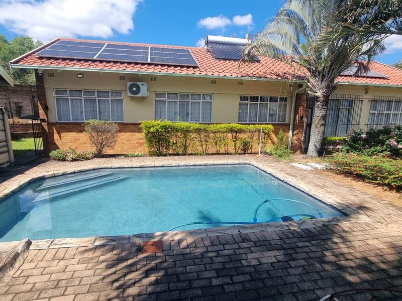 Lowveld retreat near KaNymanzane Road in Karino — established garden with towering palms, ideal for hospitality. Enjoy a black pool with waterfall and thatch lapa; eight bedrooms, five baths.