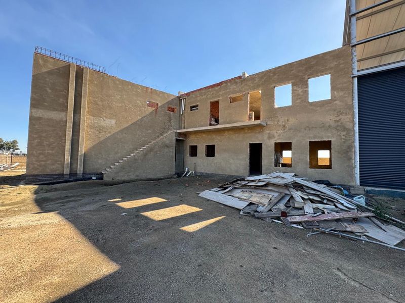 Prime industrial site by Sasol Charlie 1 main entrance, secured with perimeter fencing, dual gates and guardhouse. Partially completed 787 m² structure with approved building plans.