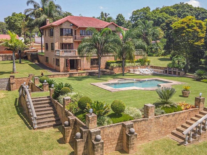 Entertainer's smallholding near White River, offering flexible guest accommodations and workshop — central lapa leading to a pool. Twelve bedrooms and ten bathrooms.