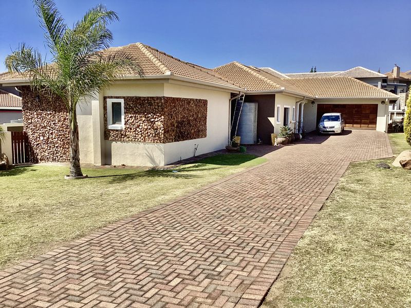 Wake up to dam and golf-course vistas in Bankenveld Estate, perfect for executive family living, with open-plan entertaining and integrated built-in braai, four bedrooms and three bathrooms.