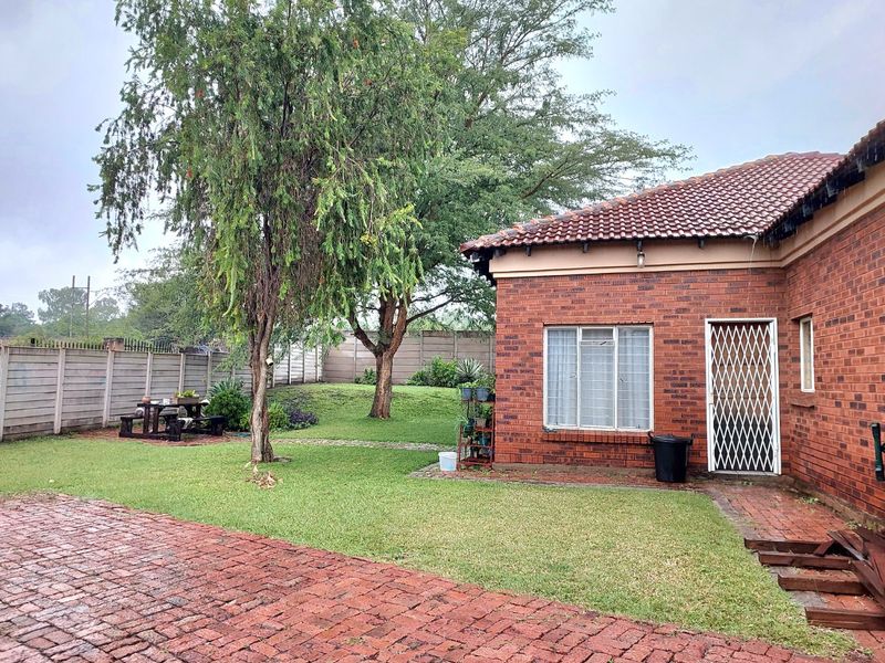 Relaxed family living near Brits Mall and reputable schools in a secure complex — private garden with built-in braai for entertaining, open-plan kitchen, three bedrooms, two baths, single garage.