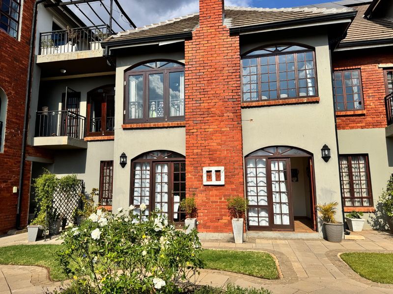 Relaxed estate living in Landsmeer Equestrian Estate with open-plan entertaining and enclosed braai featuring a built-in grill; ground-floor three-bedroom apartment with two baths and double garage.