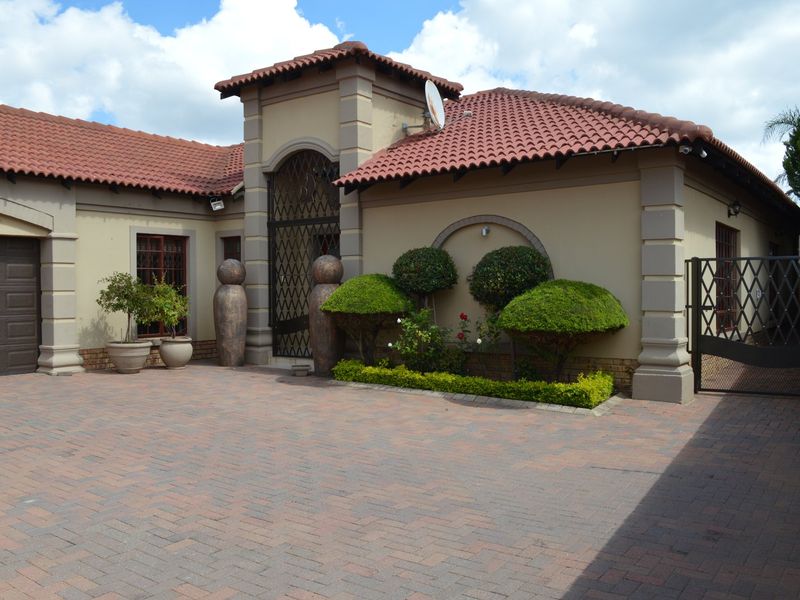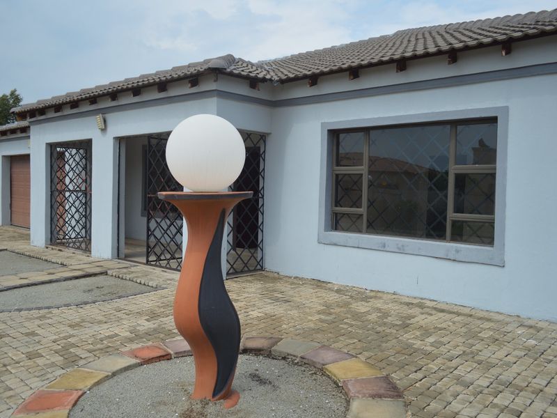 Relaxed family living in Flamwood, Klerksdorp with easy-care tiled interiors and a pet-friendly yard; spacious patio with built-in braai, four bedrooms, two bathrooms, double garage.