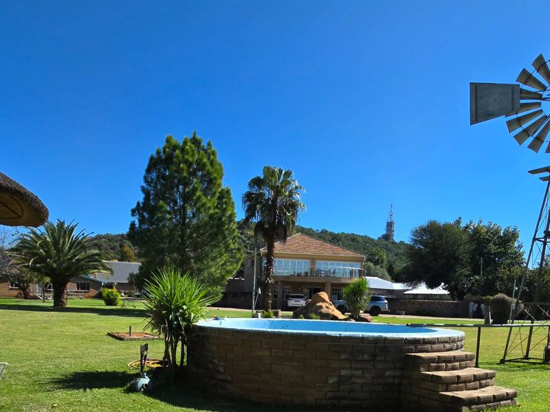 Relax in country living minutes from town, set on 8,749 m² of rugged landscape with sweeping views, private boma braai, swimming pool, three beds, two baths and six garages.