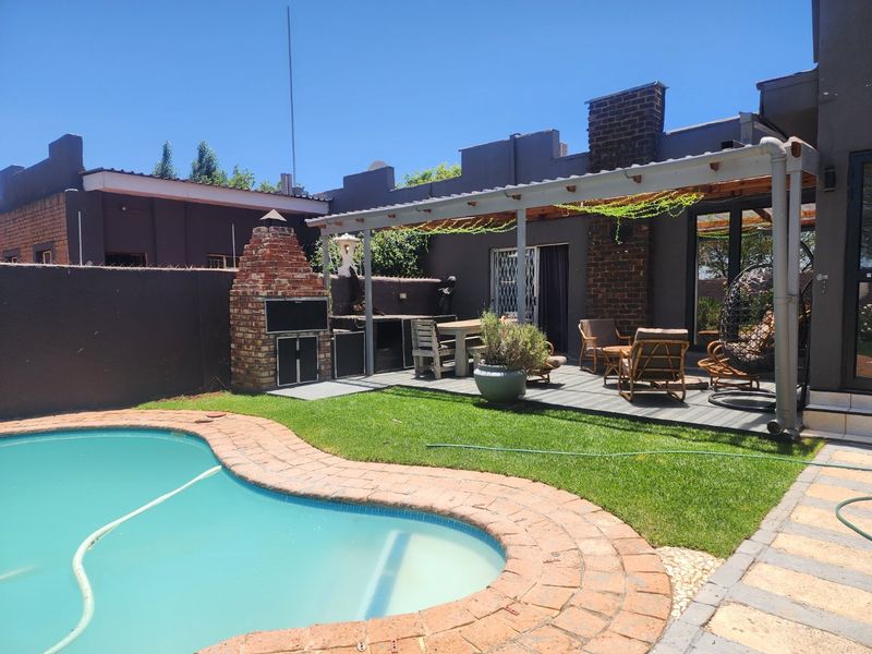 Entertainer's oasis in La Hoff with enclosed lapa and built‑in braai, sparkling pool and borehole‑fed gardens. Extra storeroom convertible to flatlet, secure parking for five. 3 beds, 2 baths.