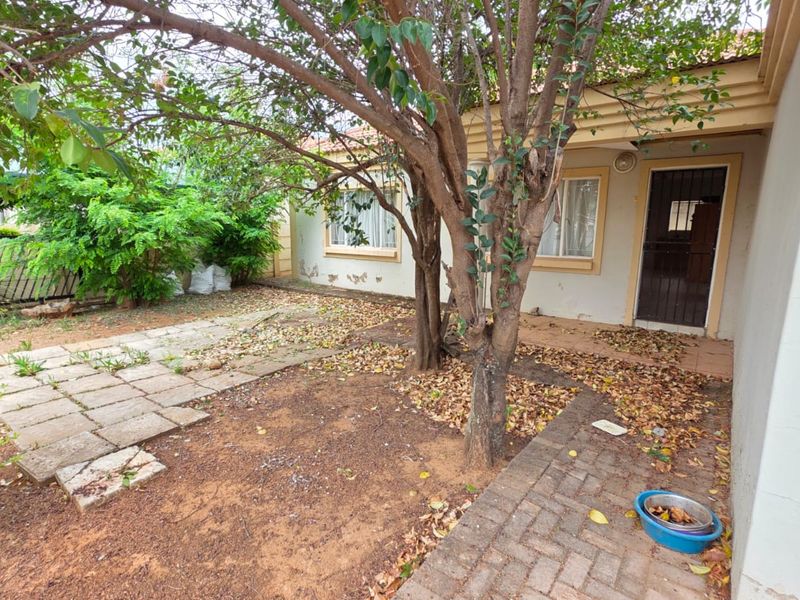 Relaxed suburban living in Meiringspark Ext 4, Klerksdorp — open-plan lounge and kitchen, private 350 m² garden with mature trees, single garage and two bedrooms.