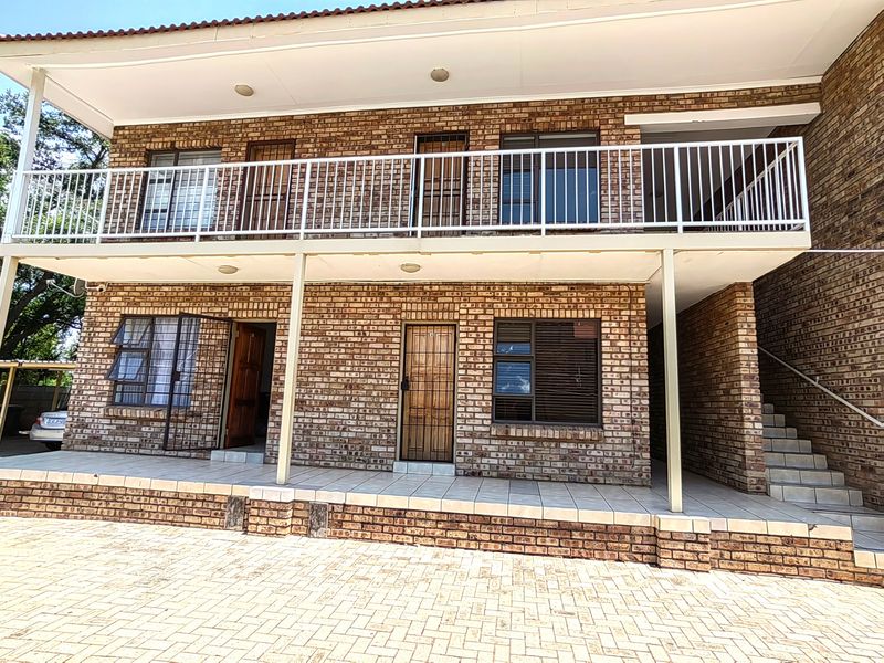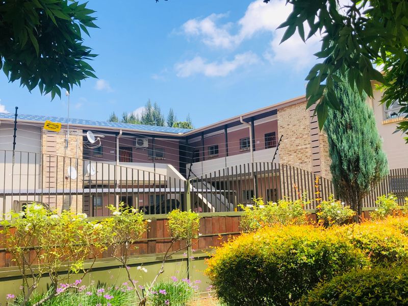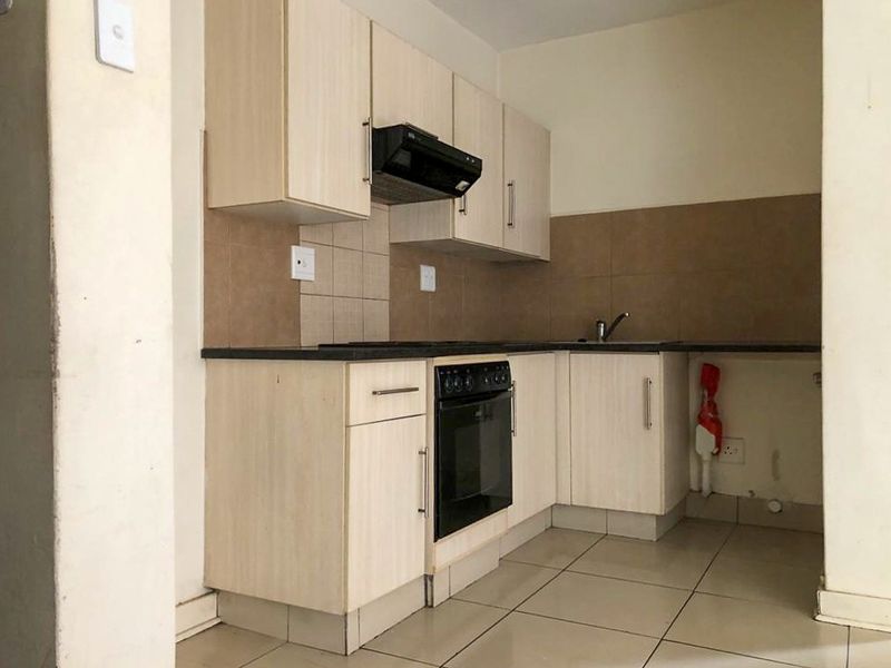 Relaxed, secure community living with communal braai and small balcony for morning coffee; well-kept complex with automated gate. Includes two bedrooms with built-in desks, open-plan living, one bath, two parking.