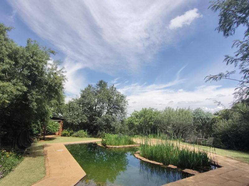 Escape to a Bushveld retreat at the Magaliesberg foothills, perfect for sundowners and group retreats with guest chalets amid treed gardens and mountain views; natural pool with waterlilies and goldfish.