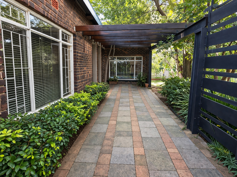 Enjoy relaxed outdoor living and scenic sunsets in Geelhoutpark, Rustenburg, with a tidy walled garden and sweeping views — near Kloof Resort trails; three bedrooms, three bathrooms, double covered parking.