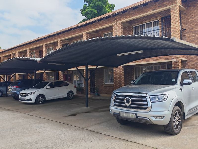 Urban convenience in the heart of Rustenburg Central, close to schools and shopping; open-plan kitchen, two bedrooms, one bathroom and two covered parking bays.