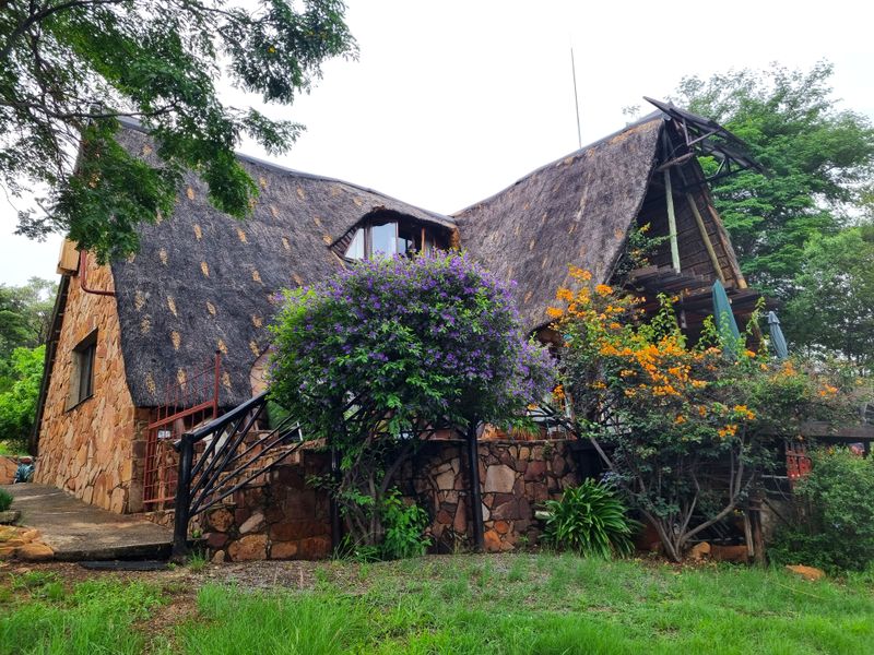 Relax in Utopia Nature Estate with daily views of Buffelspoort Dam and the Magalies Mountains — a thatched-roof, two-story home currently run as a successful B&B, ideal investment.