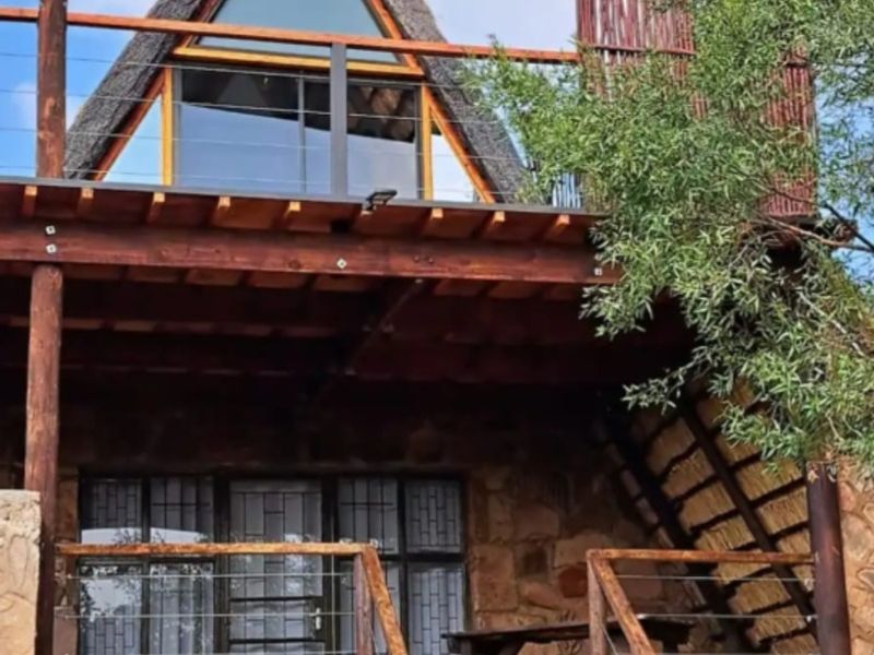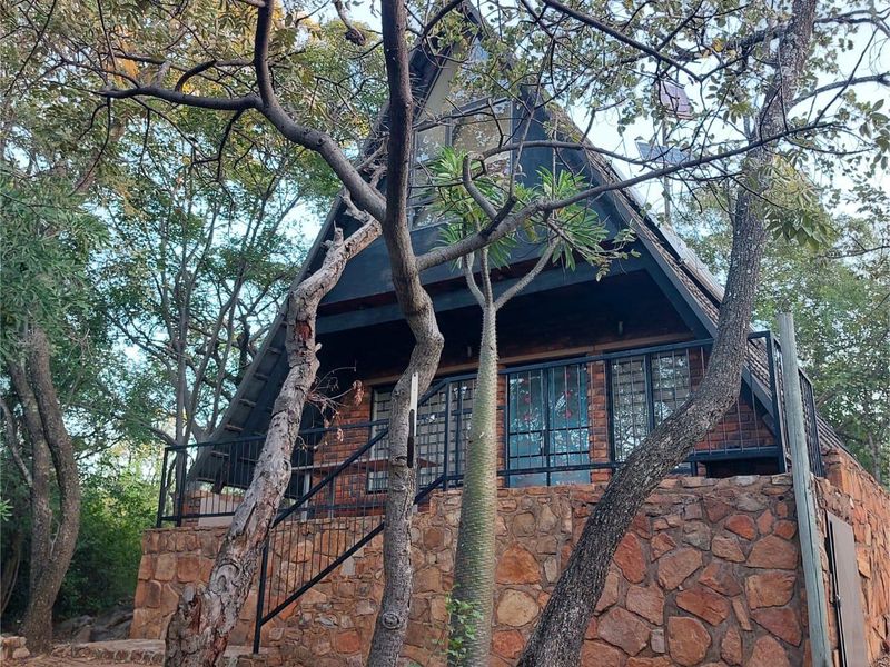 Escape to Utopia Nature Estate in the Magaliesberg Biosphere — an elevated A-frame with treetop views, deck and built-in braai, solar off-grid convenience; fully furnished, 2 beds, 1 bath.