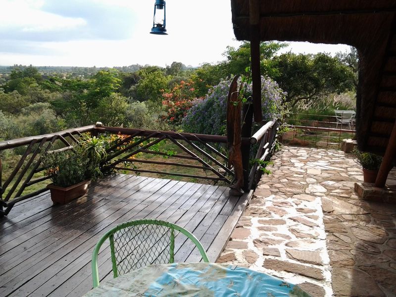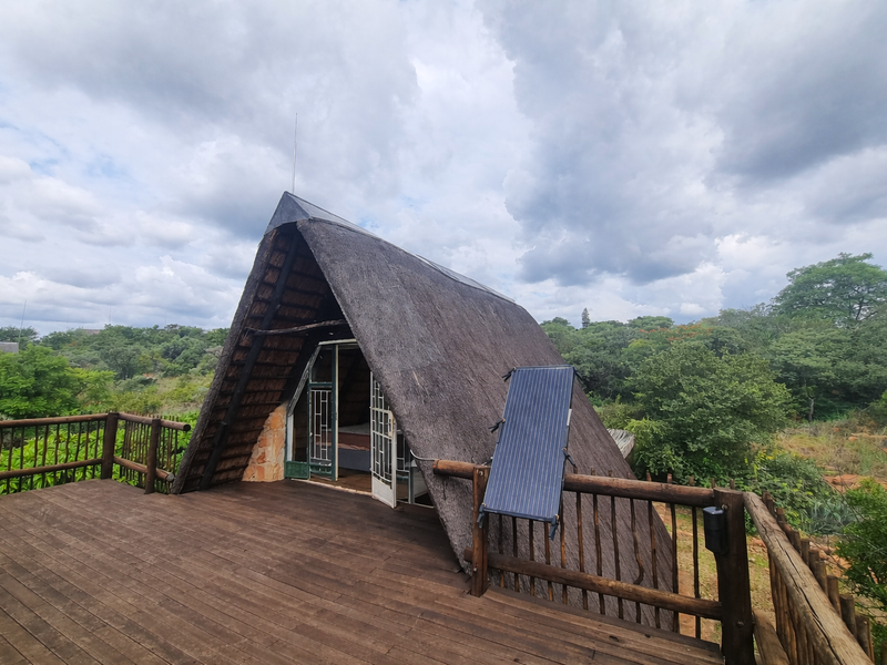 Nature-filled retreat in Utopia Nature Estate, Buffelspoort — relax on a deck overlooking Buffelspoort Dam with outdoor shower and solar power; two bedrooms, one bathroom.