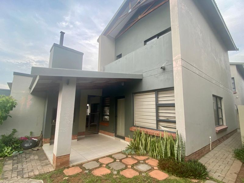 Relaxed estate living in Nyala Rock Estate, Waterval East — contemporary open-plan interior flowing to a patio and garden, ideal for entertaining; three bedrooms, two baths, single garage and carport.