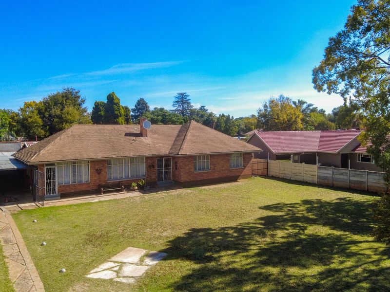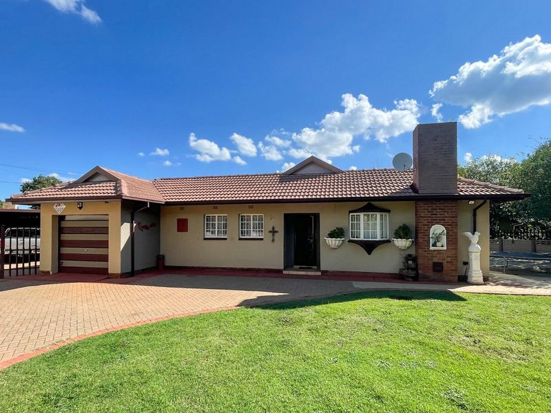 Relaxed family oasis in Stilfontein with generous TV and dining rooms, private swimming pool and extensive yard; includes separate two-bedroom flatlet and three bedrooms, one bath.