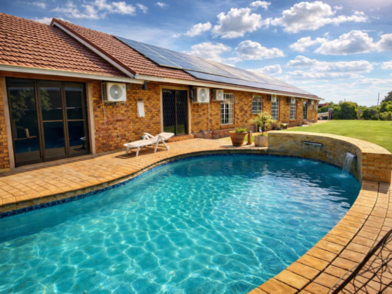 Secure, family-focused living in Vryburg with complete energy independence โ 15kVA solar, cooled battery room, private pool and lapa; five bedrooms, two bathrooms, covered parking for four.