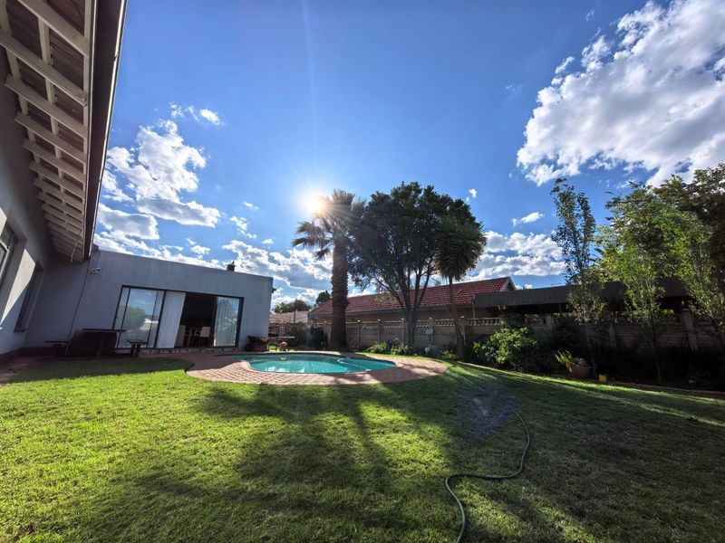Effortless indoor-outdoor family living in a quiet leafy neighbourhood, featuring a built-in braai, irrigated garden with borehole and pool — six bedrooms, four bathrooms, double garage.