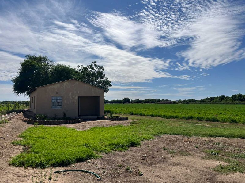 Embrace peaceful smallholding life on the N10 between Upington and Groblershoop, overlooking farmland vistas, with 5 kW solar — three bedrooms, one bathroom and garage.