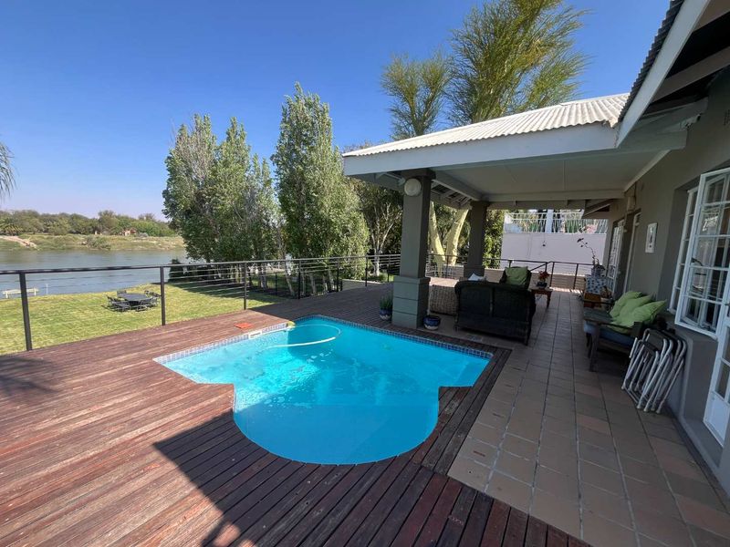 Relax riverside with sundowners from a balcony overlooking the Orange River; renovated open-plan living with a modern kitchen, private garage, secure complex and lush communal gardens.