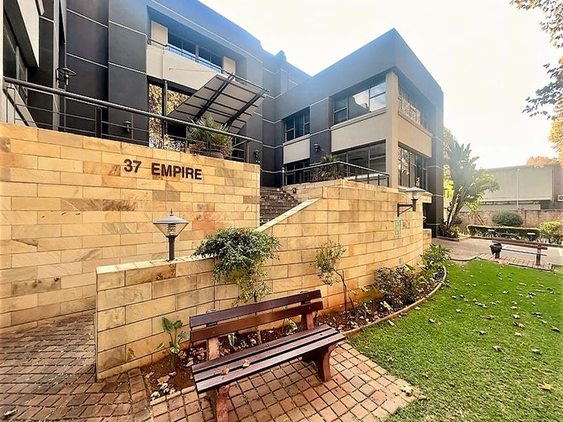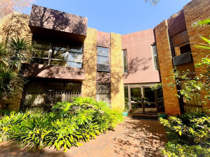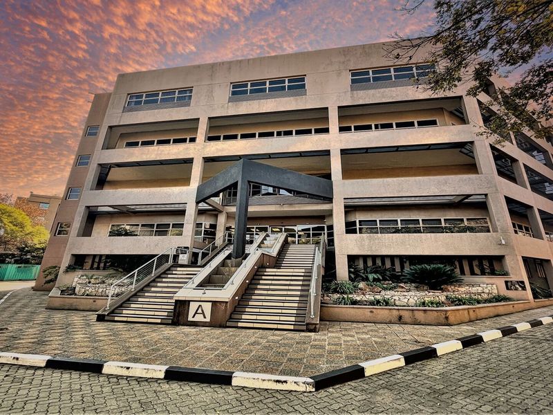 High-profile Jan Smuts Avenue property offering A-Grade 2017 m² offices with glazed double-volume foyer, elegant staircase, heritage guest house, bar entertainment area, manicured gardens, 121 parking and backup systems.