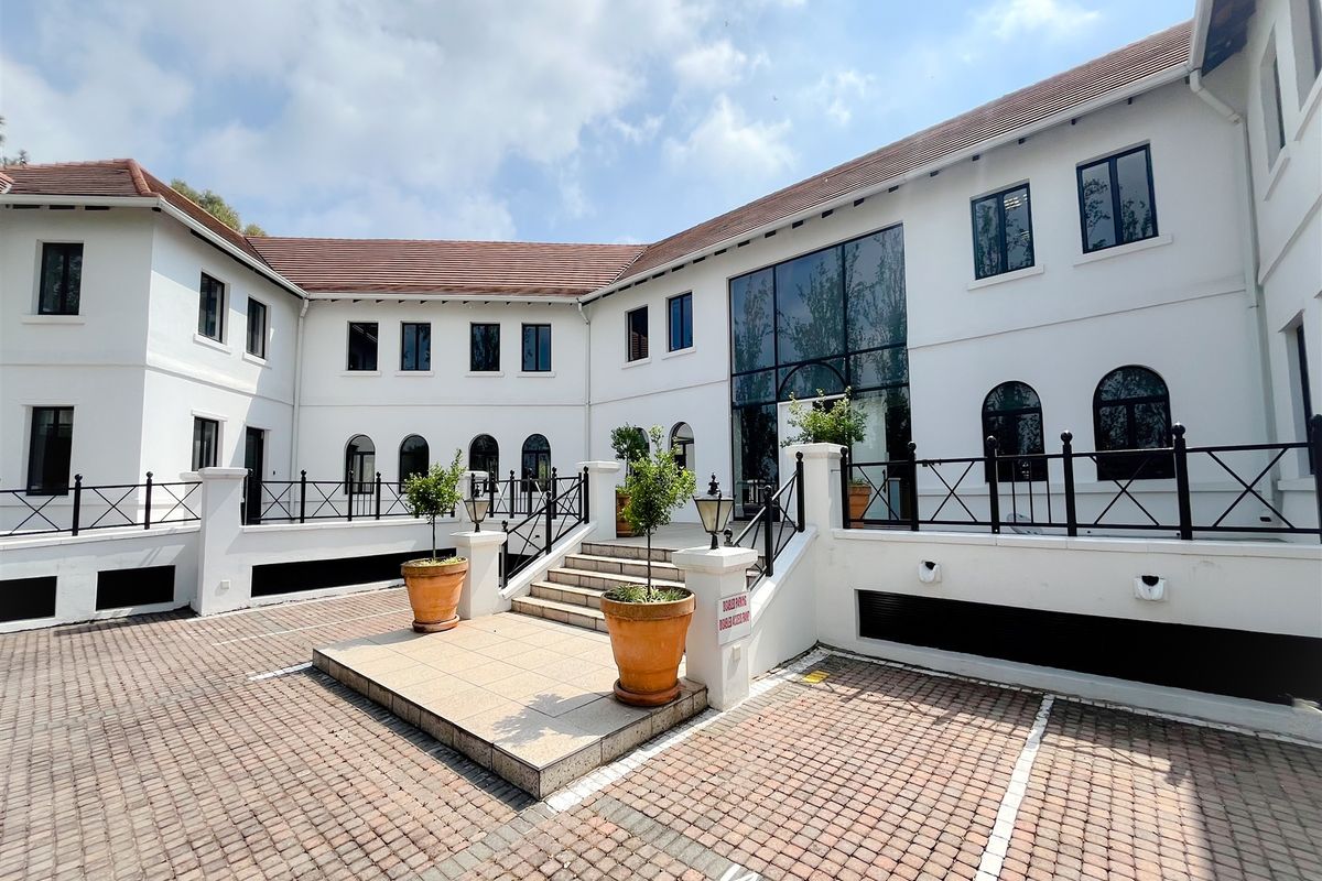 High-profile Jan Smuts Avenue property offering A-Grade 2017 m² offices with glazed double-volume foyer, elegant staircase, heritage guest house, bar entertainment area, manicured gardens, 121 parking and backup systems.