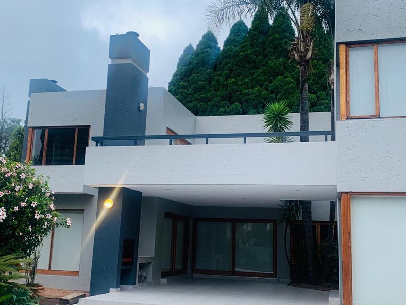 Effortless entertaining with undercover braai, pool and private garden in Bedfordview, set around a light-filled atrium and double-volume entrance; four bedrooms, 3.5 baths and a four-car garage.