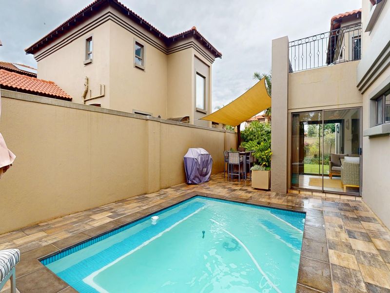 Entertainer's Bali-style cluster living in Bartlet, Boksburg — seamless indoor-outdoor flow to garden and pool with inside braai and bar, four bedrooms, three bathrooms, double garage.