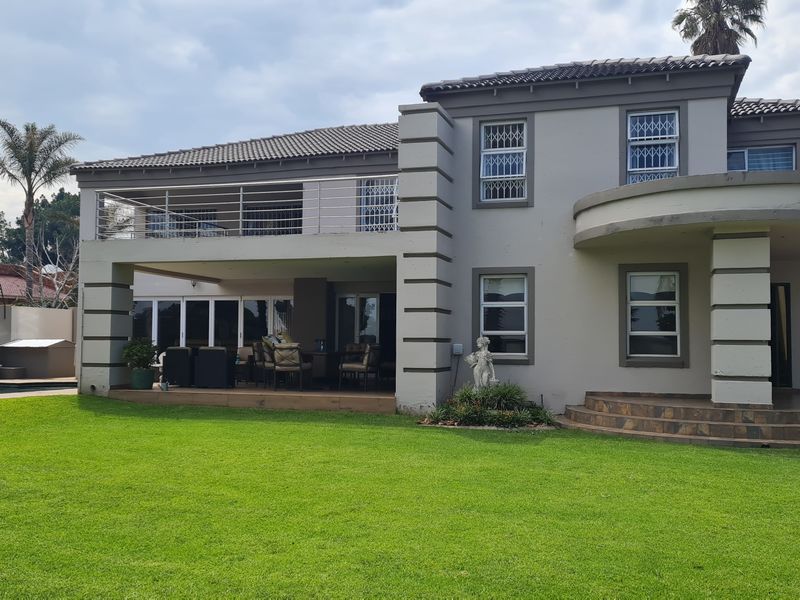 Entertainer's paradise in a secure gated estate — pool, built-in braai and expansive entertainment space, two granite-topped kitchens with bold red accents; seven bedrooms and multiple garages.