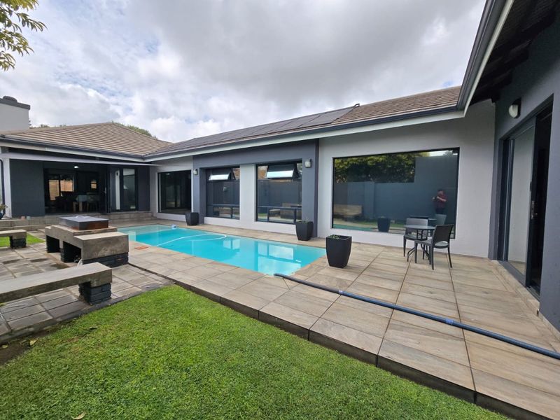 Prestigious neighborhood estate with sun-drenched open-plan living, sunroom and private cinema, sparkling pool and guest flatlet — main bedroom downstairs. Five beds, three baths, three garages.