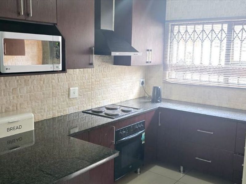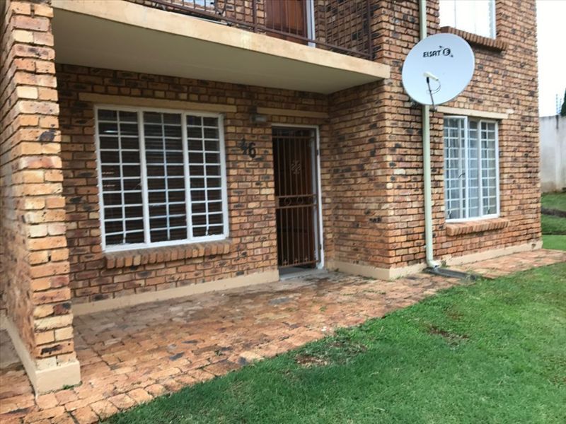 Quiet ground-floor retreat in Terenure with undercover patio and built-in braai overlooking a grassy courtyard; granite kitchen, near malls and OR Tambo, two bedrooms, two baths, 24/7 security.