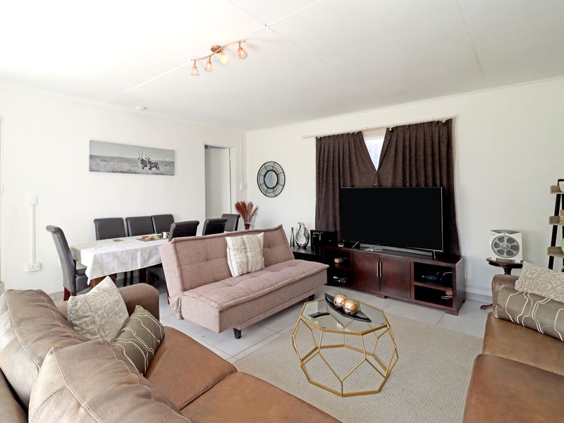 Family-focused entertainer in Woodlands Estate, Barbeque Downs — open-plan living flows to a patio with built-in braai and heated pool. Five bedrooms, three bathrooms, double garage.