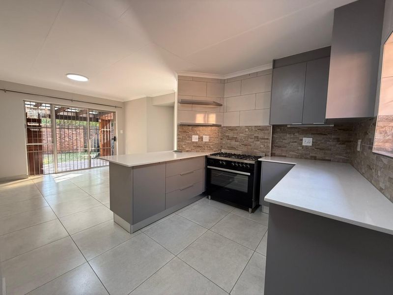 Completely renovated duet in a quiet, established neighbourhood — Caesarstone kitchen, ensuite domestic quarters, two living areas, automated garage and carport; upgraded plumbing and security. 2 beds, 2 baths.