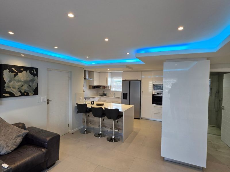 Contemporary Southern Suburbs apartment with gourmet island kitchen and balcony ideal for braai, bespoke home-office desk, sleek high-gloss finishes, two ACs and secure parking. 2 beds, 1 bath.