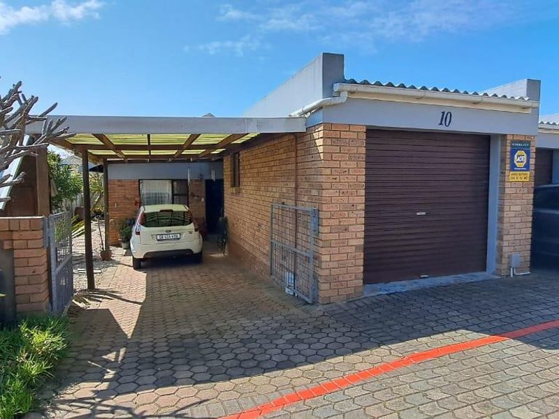 Relaxed coastal living in popular Mossel Bay, close to beach, golf and amenities, with a private fenced garden and covered entertainment area with built-in braai — three bedrooms, 2.5 baths, garage.