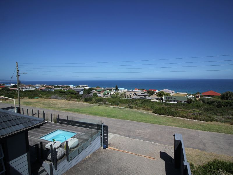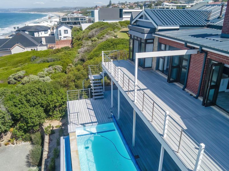 Coastal entertainer’s haven in peaceful Reebok — 180° ocean and Mossel Bay views, patio with splash pool, farm-style kitchen and separate guest-suite entrance; 6 beds, 4 baths, extensive parking.