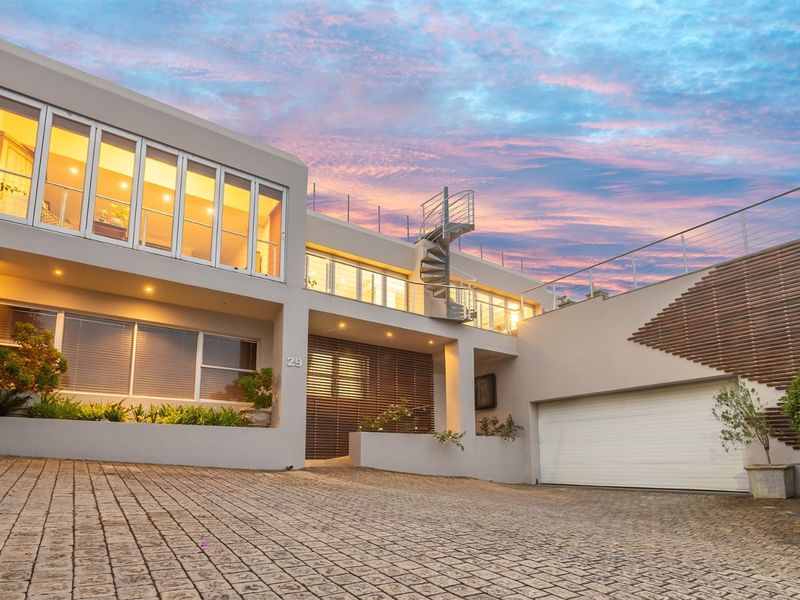 Live elevated in Plettenberg Bay with sweeping ocean and mountain views, dual panoramic decks and cinema room; seven ensuite bedrooms, wellness gym, and a four-car collector’s garage.