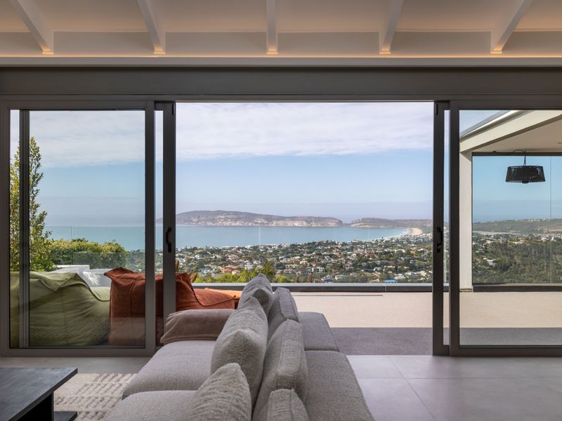 Coastal entertainer in Plettenberg Bay with panoramic Robberg views, seamless open-plan living and terraced landscaped gardens; features twin heated pools, designer kitchen and six bedrooms, seven bathrooms.