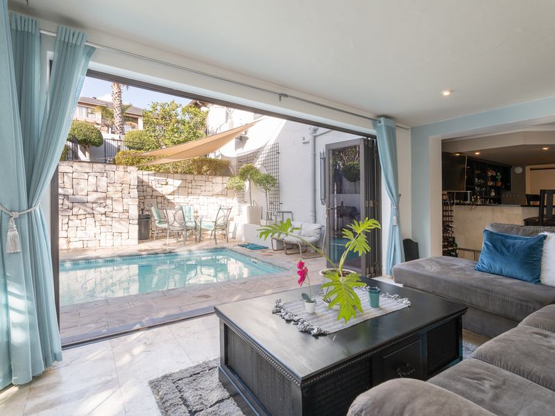 Entertainer's retreat with partial ocean and mountain views, landscaped garden and covered pool. Expansive open-plan living with built-in braai and bar; five bedrooms, double garage and secure gated grounds.